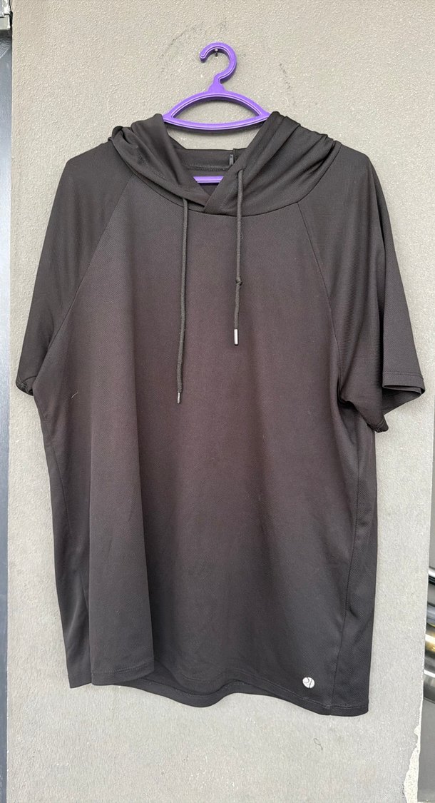 Erkek siyah tişört, kapüşonlu yüksek yakalı ve kısa kollu, rahat kesimiyle günlük sokak stiline uygun. Pürüzsüz sentetik kumaştan, zahmetsiz şıklık sunar.