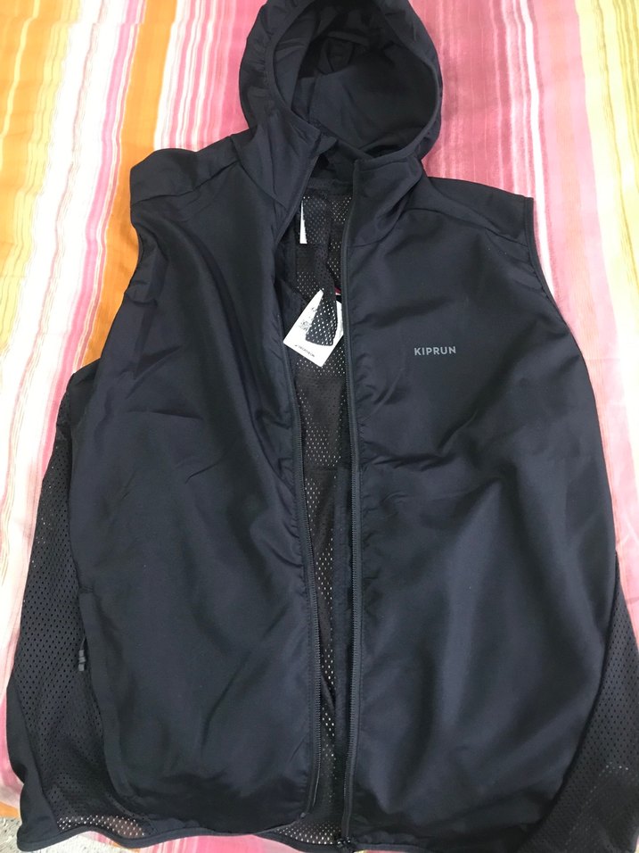 Yumuşak ve sıcak kumaştan yapılmış, kapüşonlu ve fermuarlı siyah kolsuz yelek. Yüksek yakalı ve vücuda oturan kesimiyle günlük rahat sokak stili için uygundur. Üzerinde "KIPRUN" markası bulunmaktadır.