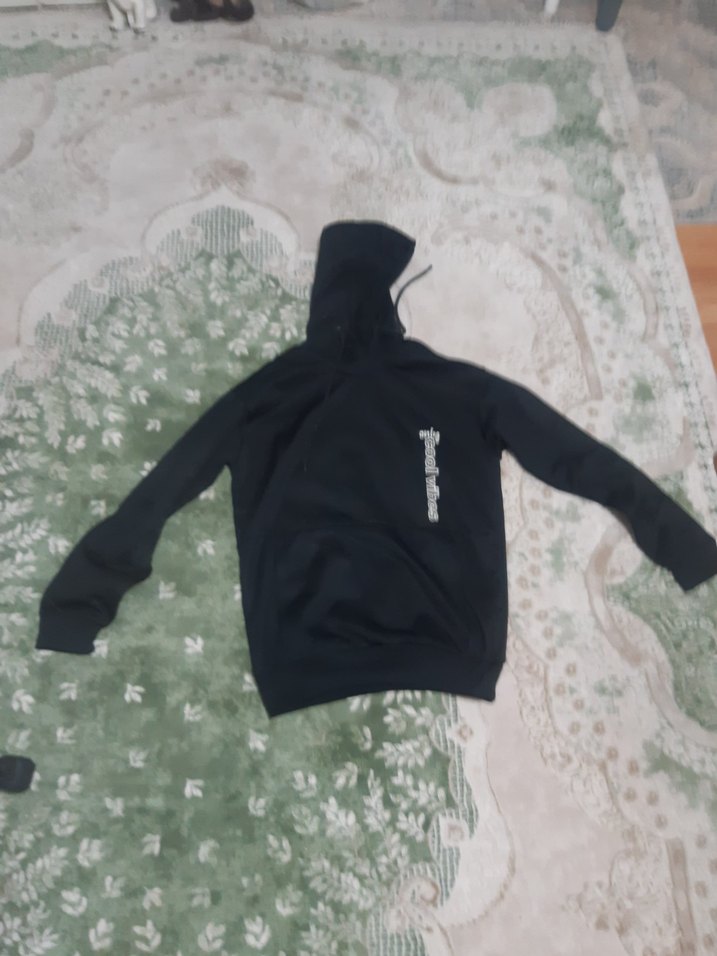 Erkekler için siyah kapüşonlu sweatshirt, uzun kollu ve rahat kesimlidir. Yumuşak polar kumaştan üretilmiş, günlük kullanım için uygundur.