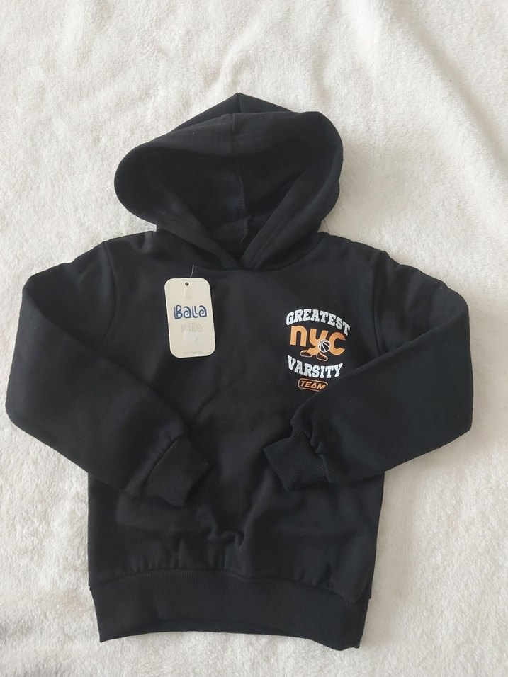 Erkekler için siyah kapüşonlu sweatshirt, bol kesim ve uzun kolludur. Yumuşak ve sıcak kumaştan yapılmıştır. Baskılı varsity tarzı tasarım içerir. 3 iplik kumaşı. 1 yaş