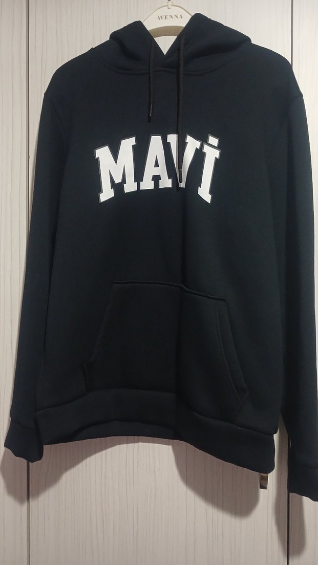 erkek siyah kapüşonlu sweatshirt, uzun kollu ve bol kesimdir. Örgü dokusu ve önünde "MAVI" baskısı bulunur, günlük rahat kullanım için uygundur. yenidir hic kulanilmadi