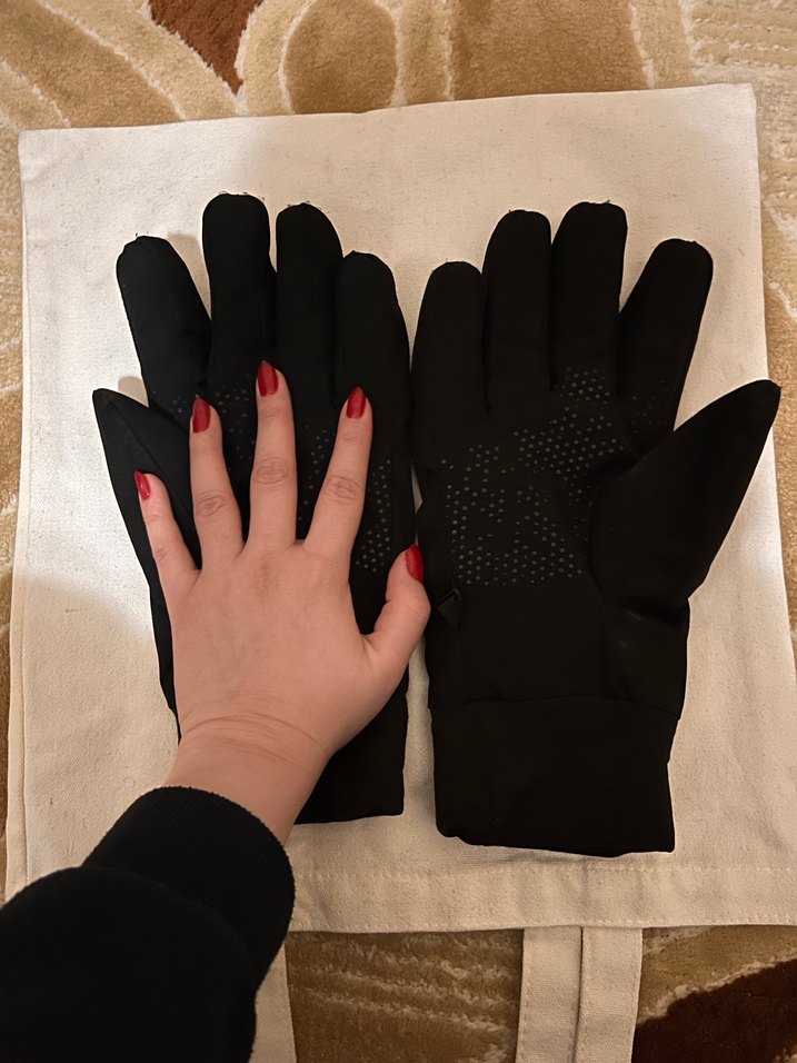Siyah biker tarzı erkek kar eldiveni. Kayağa giderken kullanıldı, 2-3 defa giyildi. Gerçekten ellerinizi hiç üşütmüyor sıcacık tutuyor. M-L beden. Kıyaslama için kendi elimle fotoğrafını aldım. Erkekler için daha uygun olacaktır.