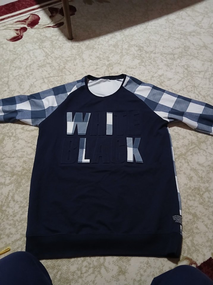 Uzun kollu, kareli kollara sahip siyah sweatshirt. Yuvarlak yaka ve bol kesim, sentetik kumaştan örme detaylı. Önde baskılı desenle sokak stili tamamlanmış.