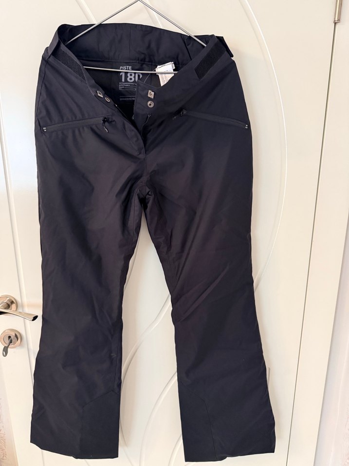 Erkekler için siyah, kemerli kayak pantolonu. Sentetik kumaştan, normal boyda ve dış mekan kullanımı için uygundur. Spor sokak tarzında şık ve rahat bir modeldir.