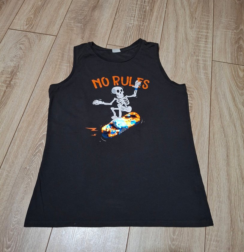 Siyah renkli, kolsuz erkek tişörtü, kaykay üzerinde iskelet baskılı ve "NO RULES" yazılıdır. Yumuşacık dokusu var.3 kere giyildi çünkü çabuk boy atıp kilo aldı oğlum.Üzerindeki yumuşak paket işlemesi renk değiştirebiliyor.Çok severek giymişti aynı modelin daha büyük bedenini aldık bizde.