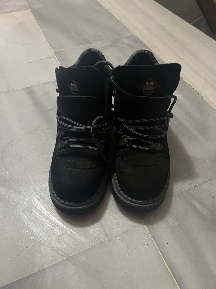 Siyah, kemerli, desen içermeyen erkek goth botu, koyu renk ve grunge punk tarzına uygun.