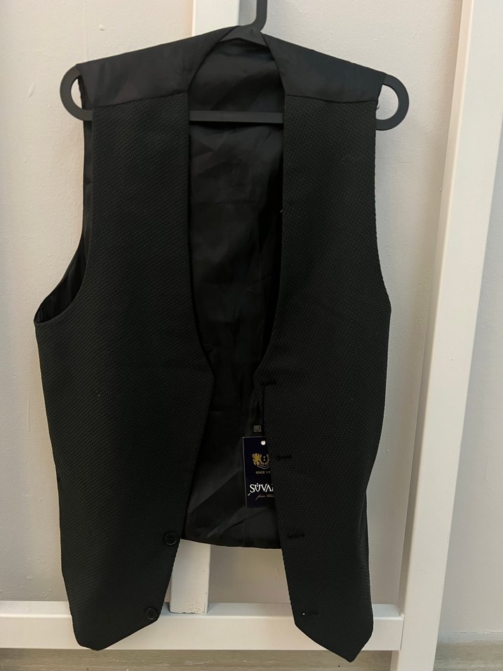Erkekler için kolsuz siyah yelek, notlu yaka ve kemerli bel detayına sahiptir. Normal kesim ve midi boyda, sentetik kumaştan üretilmiştir.