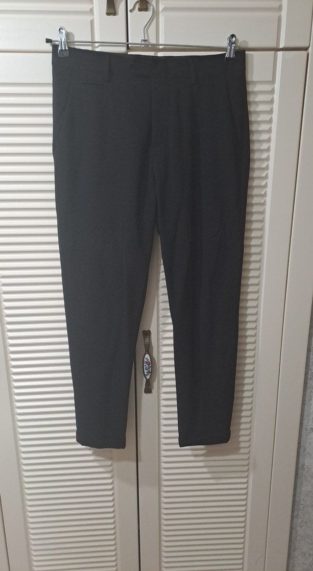 Erkek için siyah kumaş Zara pantolon, normal kesim ve midi boyda. Kemer detayı ve düz sentetik kumaş ile ofis kullanımı için uygun.