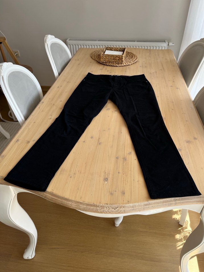 Siyah keten pantolon, normal kesim ve midi boyda, kemerli. Günlük sokak stiline uygun rahat bir model.erkek