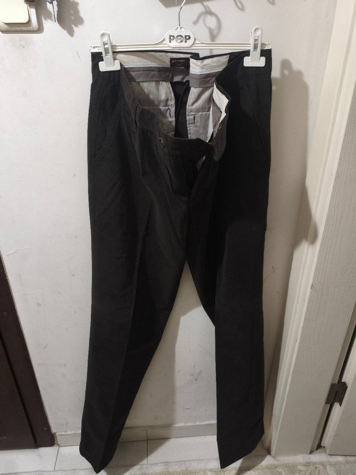 Siyah, regular fit, normal boy kemerli erkek pantolonu. Sentetik kumaştan, ofis ve gündelik sokak stiline uygun.