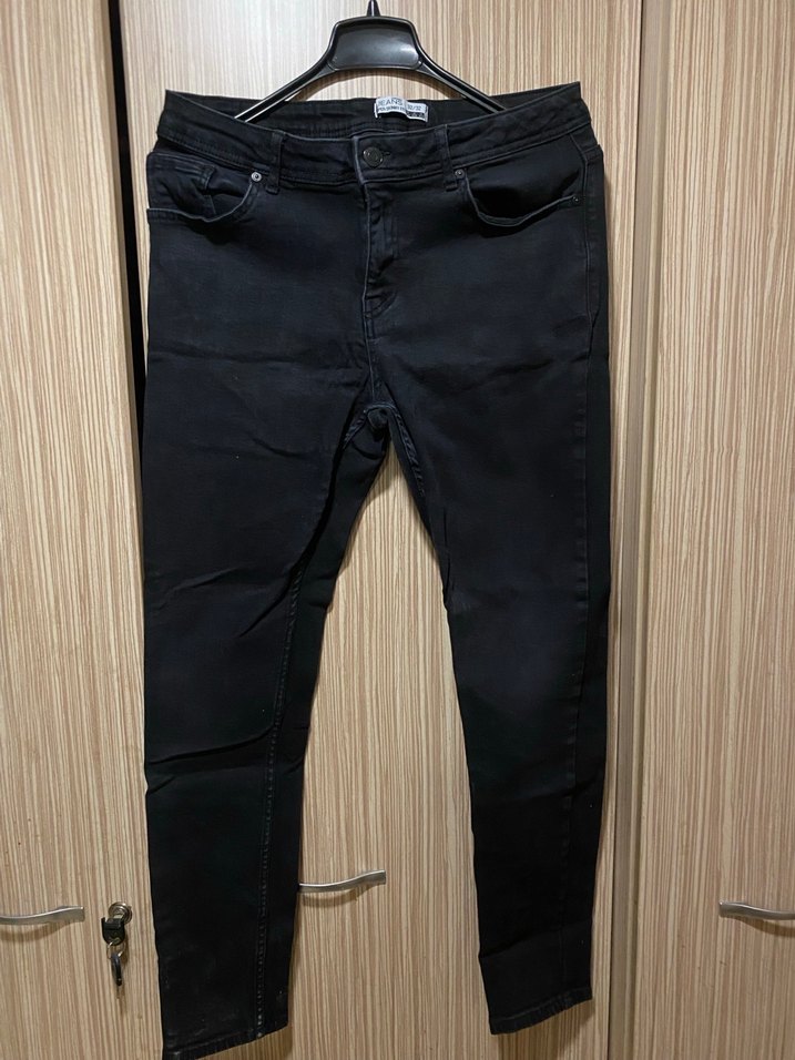 Siyah denim kumaştan, regular fit ve normal boyda, kemerli erkek kot pantolon. Günlük sokak stili için uygundur.