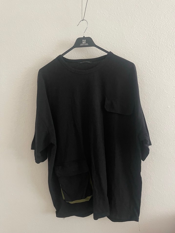 Erkekler için siyah keten oversize tişört, yuvarlak yaka ve kısa kollu, günlük kullanıma uygun rahat ve şık. Önünde cep detayı var