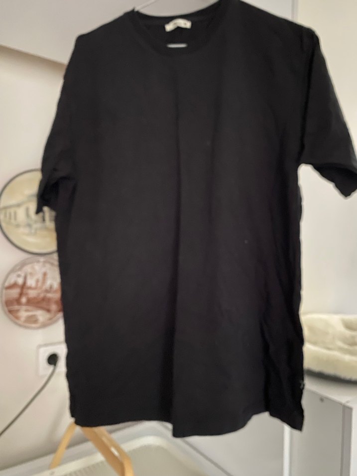 Siyah keten kumaştan, yuvarlak yaka ve kısa kollu erkek tişörtü. Salaş kesimi ve desensiz tasarımıyla günlük ve minimalist sokak stiline uygundur.
