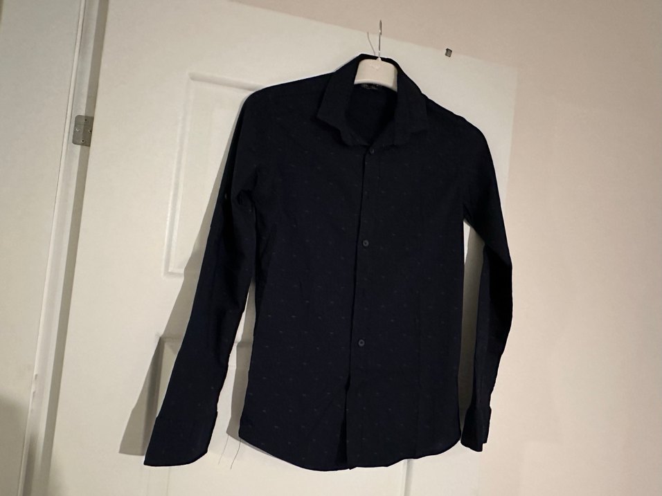 Siyah keten erkek gömlek, yakalı, uzun kollu ve düğmeli ön kısmıyla ofis ve günlük kullanıma uygundur.
