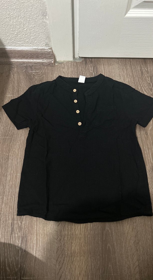 Keten kumaştan, siyah renkli, kısa kollu, düğmeli ve bisiklet yaka erkek gömleği. Rahat ve bol kesim, günlük kullanıma uygun.