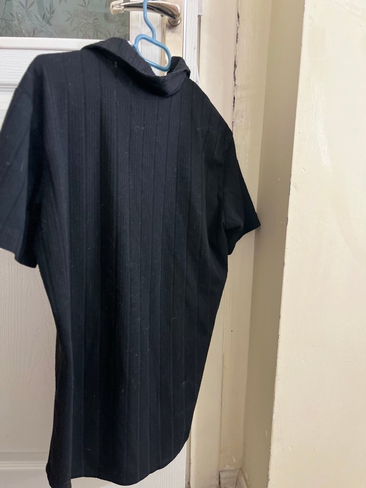 Erkekler için siyah, boğazlı ve kısa kollu, pileli detaylı, normal midi boyda, sentetik kumaştan yapılmış, minimal sokak stili tişört. ÇOK ŞIK VE GÜZEL BİR PARÇA