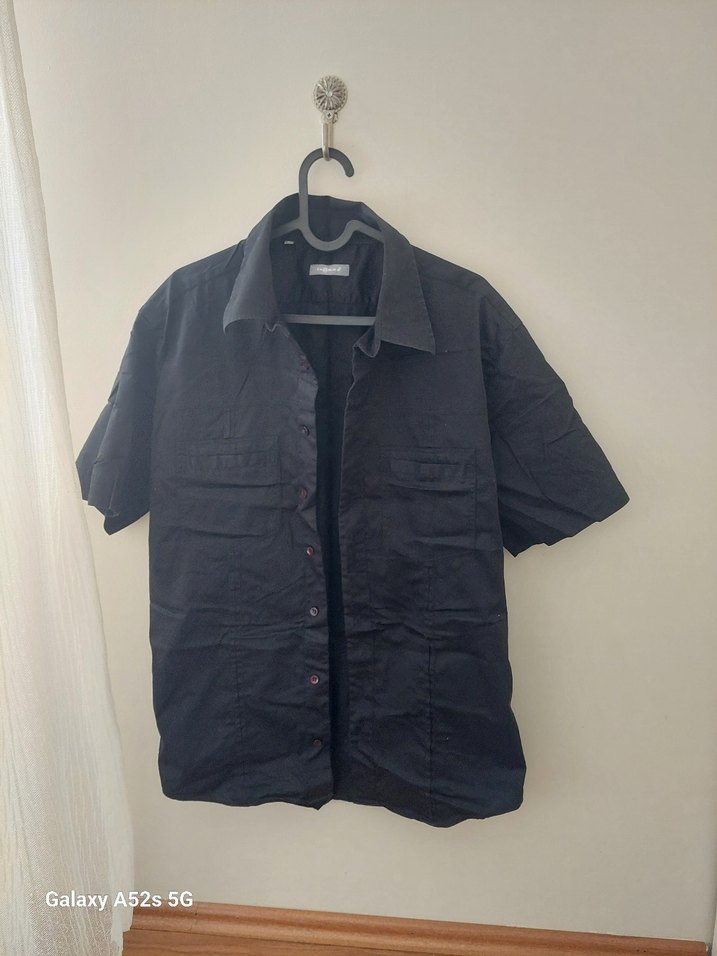Erkek siyah gömlek, kısa kollu ve yakalıdır. Düğmeli ön kısmı, bol kesimi ve normal boyu ile rahat bir tarz sunar.