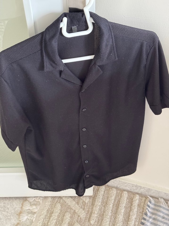 Erkekler için keten kumaştan yapılmış, düğmeli, yakalı ve kısa kollu siyah gömlek. Rahat kesimi ve normal boyu günlük kullanım için uygundur. Minimalist tasarımıyla trend sokak stiline uyum sağlar.