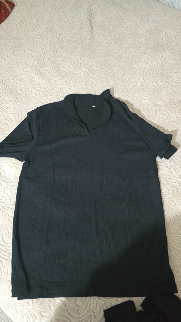 Siyah keten erkek polo tişört, kısa kollu ve bol kesim. Yaka tipi klasik yaka, desensiz ve günlük kullanıma uygun sade stil.