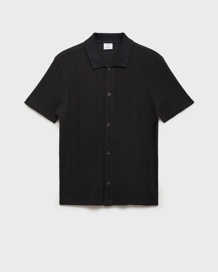 Erkek siyah triko polo tişört, kısa kollu ve düğmeli ön yapıya sahiptir. Rahat kesimi ve minimalist tasarımıyla ofis kullanımı için uygundur. ✨