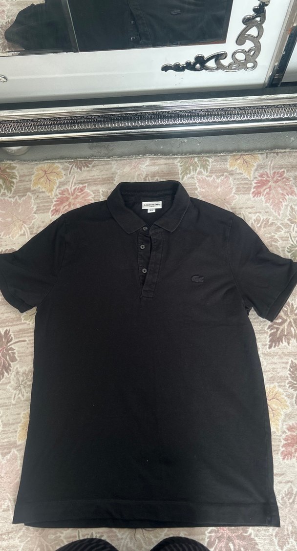 Erkek siyah keten polo yaka tişört, kısa kollu, düğmeli ve yakalıdır. Rahat kesimi ve günlük kullanıma uygun ışıktan dolayı rengi değişik görünüyor