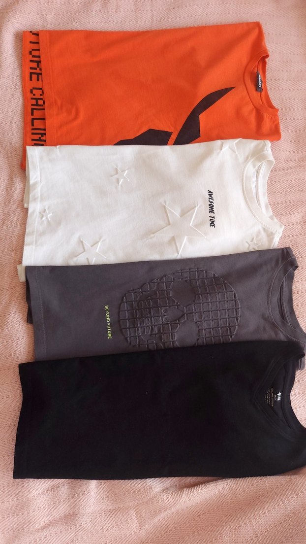 4 adet kisa kollu tshirt. turuncu olan mat turuncu isikdan dolayi parlak cikti. markalari ve bedenleri resimde mevcuttur. temiz sorunsuzdur