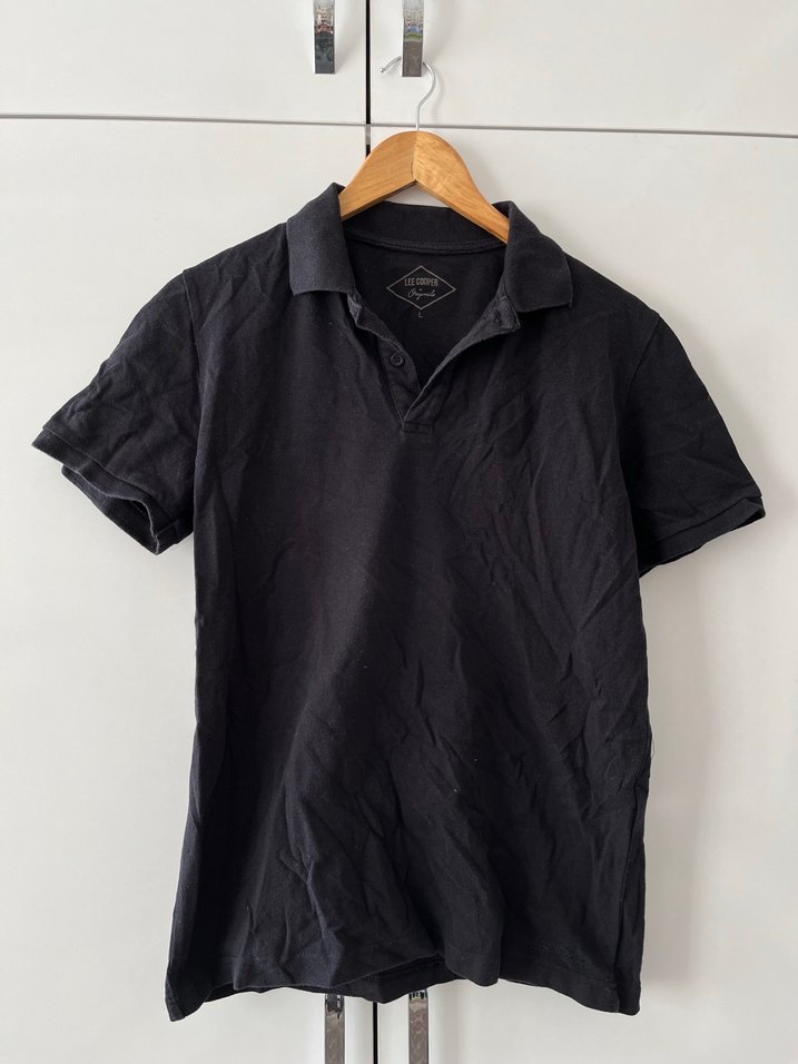 Erkekler için siyah renkli, yakalı ve kısa kollu polo tişört. Nefes alabilen keten kumaştan, sade ve şehir stiline uygun, günlük kullanıma uygun dar kesim. Çok az kullanıldı.