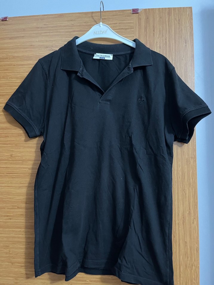 Erkek siyah polo tişört, kısa kollu ve yakalıdır. Düz ve sentetik kumaştan üretilmiş, günlük kullanım için uygundur.