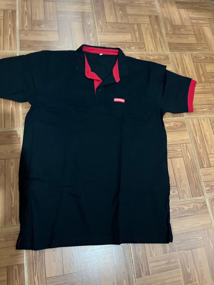 Erkek siyah polo tişört, kısa kollu ve kırmızı detaylı yakaya sahip. Baskılı deseni ve rahat kesimiyle günlük kullanıma uygun.