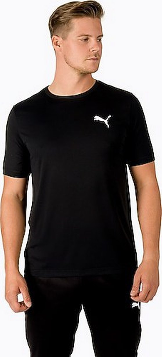 Erkekler için siyah Puma tişört, kısa kollu ve yuvarlak yaka. Düz, sentetik kumaştan, vücuda oturan kesimle sportif ve şık bir görünüm sunar.