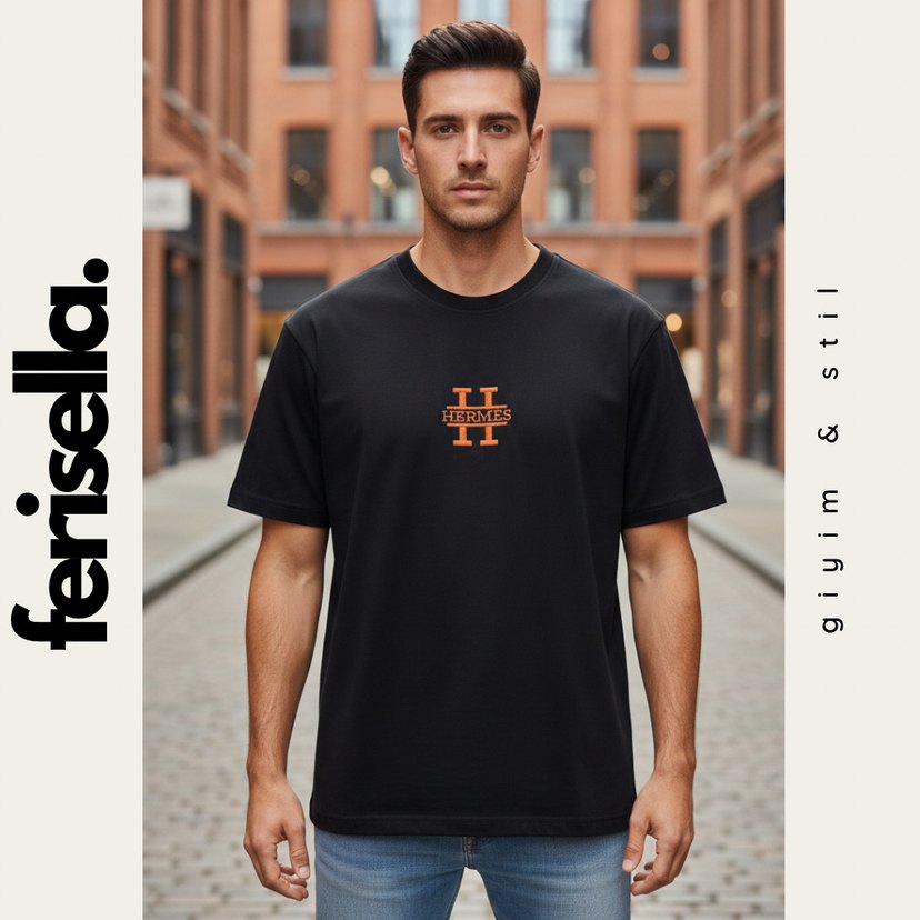 Siyah, kısa kollu, yuvarlak yaka erkek tişörtü, yumuşak kumaştan, önünde baskılı Hermès logosu ile dikkat çekiyor. S M L XL XXL MEVCUT