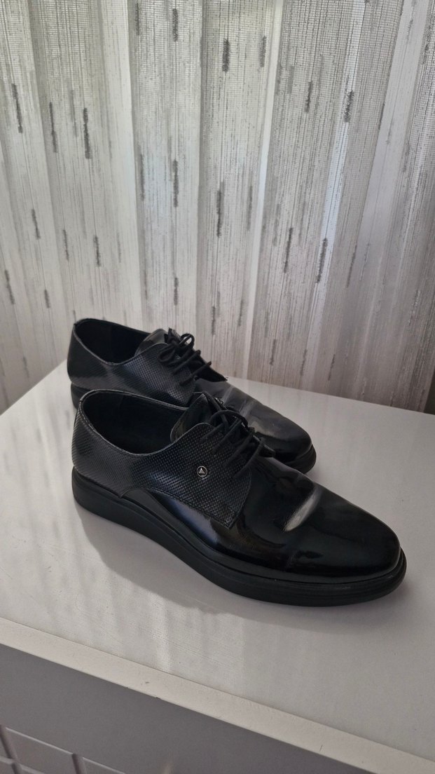 Siyah erkek klasik ayakkabı, düz kauçuk tabanlı, goth tarzıyla ofis için zahmetsiz şıklık sunar. Desensiz, koyu renk.