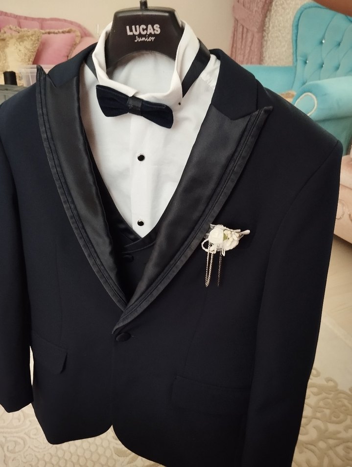 Düğmeli, klasik kesim siyah ceket, beyaz gömlek ve siyah papyon ile kombinlenmiştir. Modern klasik tarzda, düğünler için uygundur.