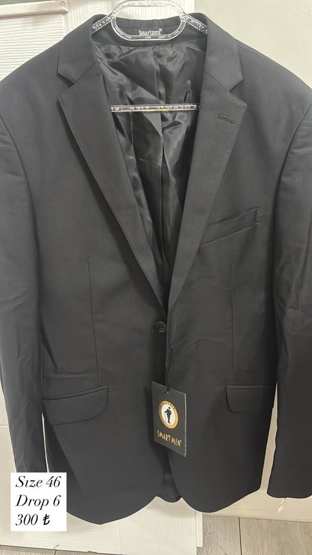 Siyah erkek takım ceketi, kesik yaka ve uzun kolludur. Düğmeli, normal kesim Adet fiyatıdır
