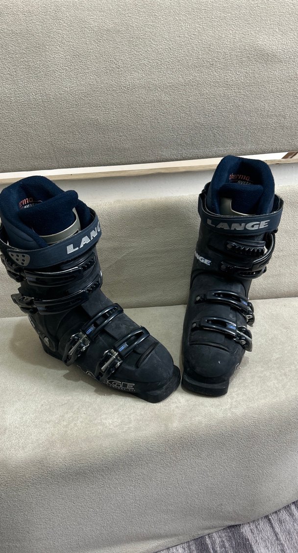 Dayanıklı kauçuk malzemeden yapılmış, bağcıksız, Velcro ve tokalı siyah Lange erkek kayak botları. Sporcu biker tarzında.