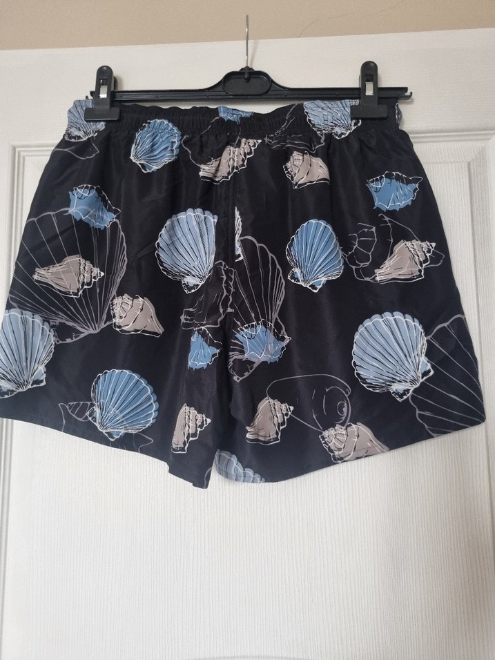 Erkekler için bol kesim, pile detaylı, koyu mavi ve siyah deniz kabuğu desenli plaj şortu. Ürün hiç kullanılmadı sıfır