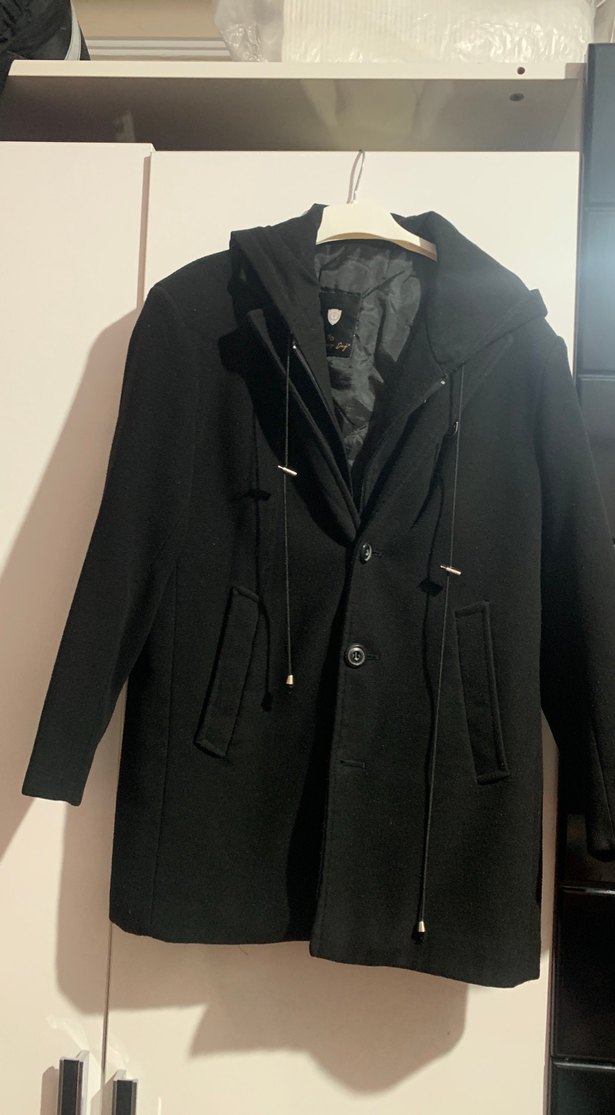 Siyah erkek kaban, kesik yaka ve düğmeli ön detaylıdır. Yumuşak ve sıcak kumaştan üretilmiş, normal kesim ve günlük kullanıma uygundur. Palto