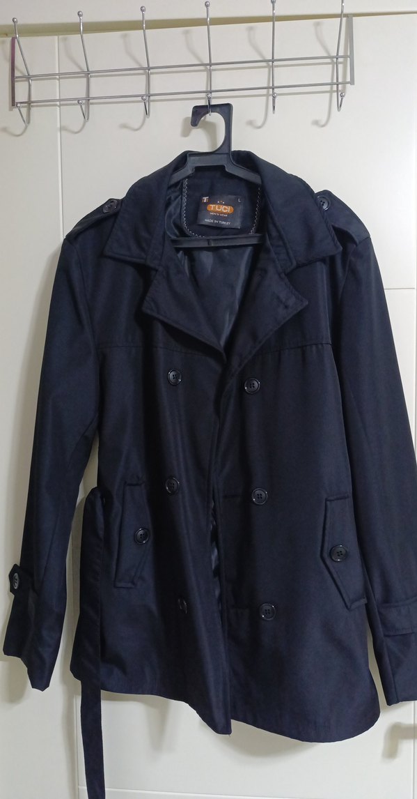 Erkek siyah trençkot, düğmeli ön ve kesimli yakaya sahiptir. Uzun kollu, normal kesim ve midi boydadır. Günlük kullanıma uygun sentetik kumaştır