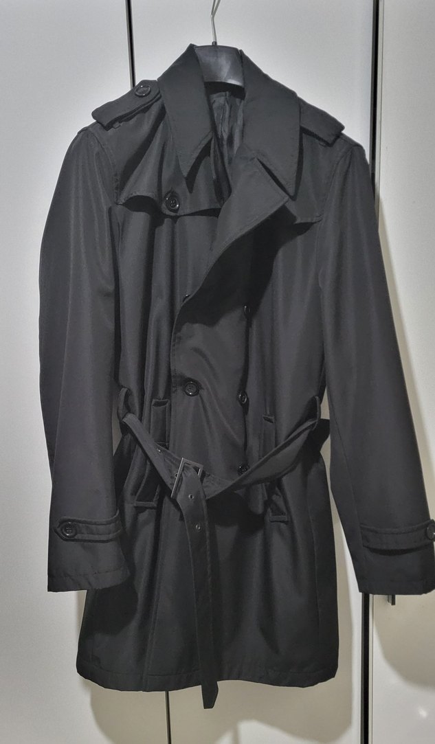 Siyah renkli midi boy, kemerli trençkot, notched lapel yakalı ve askılı kolludur. Sentetik kumaştan üretilmiş, günlük sokak stiline uygun, rahat kesimdir.