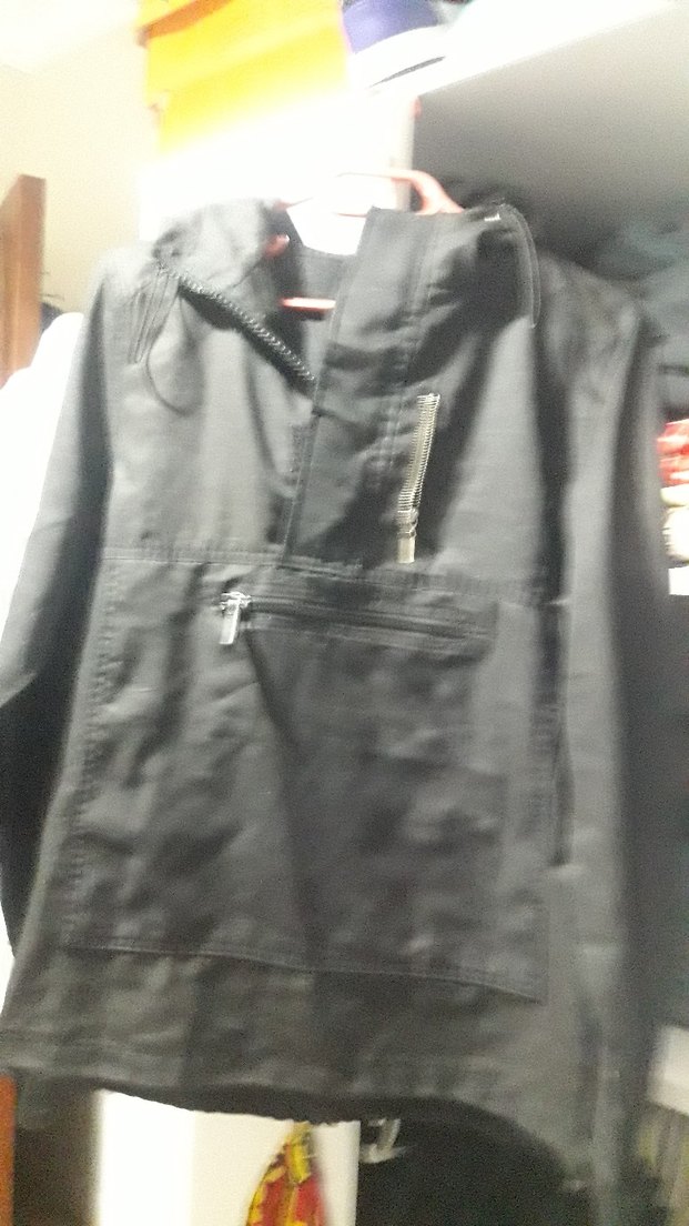 Siyah renkli, notched lapel yakalı erkek yağmurluğu, sentetik kumaştan, bol kesim ve fermuarlı ceplidir. Günlük sokak stili için uygundur. ️