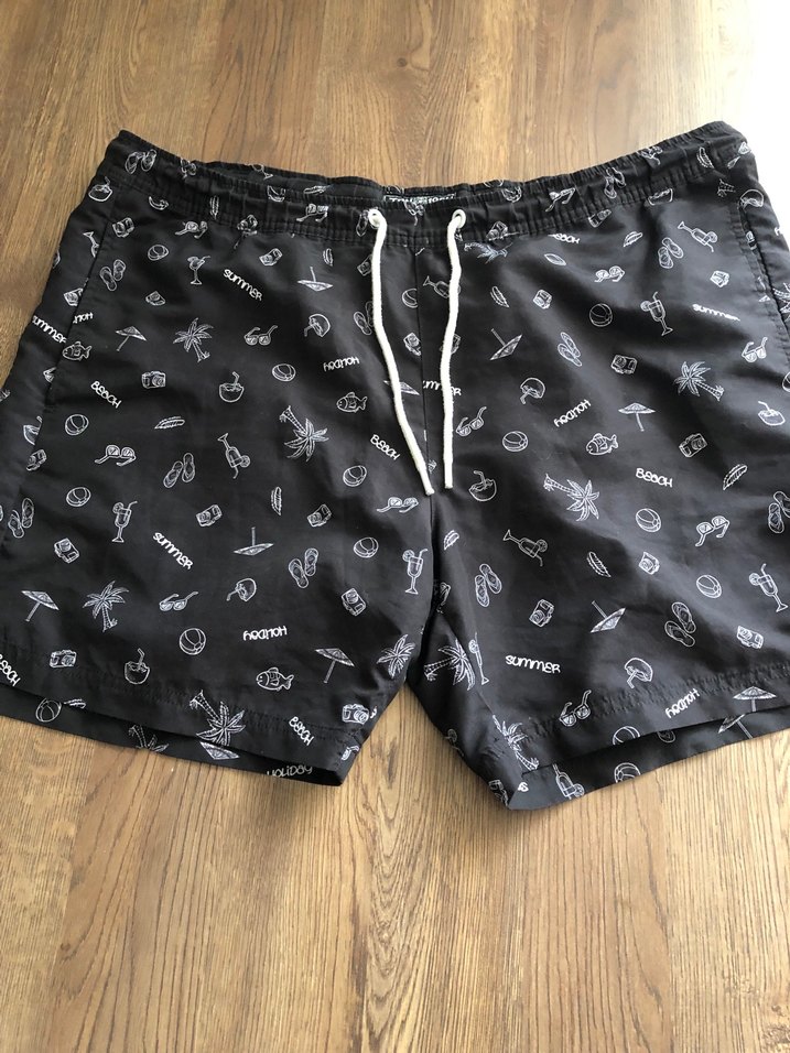 Erkekler için siyah renkte, baskılı desenli, düğmeli detaylara sahip, bol kesim mini deniz şortu. Bel 52 Boy 42