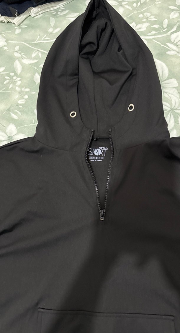 Yüksek yakalı, fermuarlı siyah mini uzunlukta erkek yağmurluk. Sentetik kumaştan, bol kesim ve uzun kollu, günlük rahat kullanım için uygundur. ️