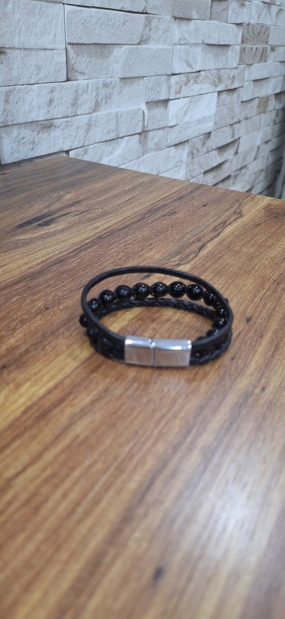 Erkek bilekliği, koyu siyah boncuklar ve sade bohem tarzıyla metal toka içerir, zamansız ve minimal bir görünüm sunar. yenidir hic kullanilmadi