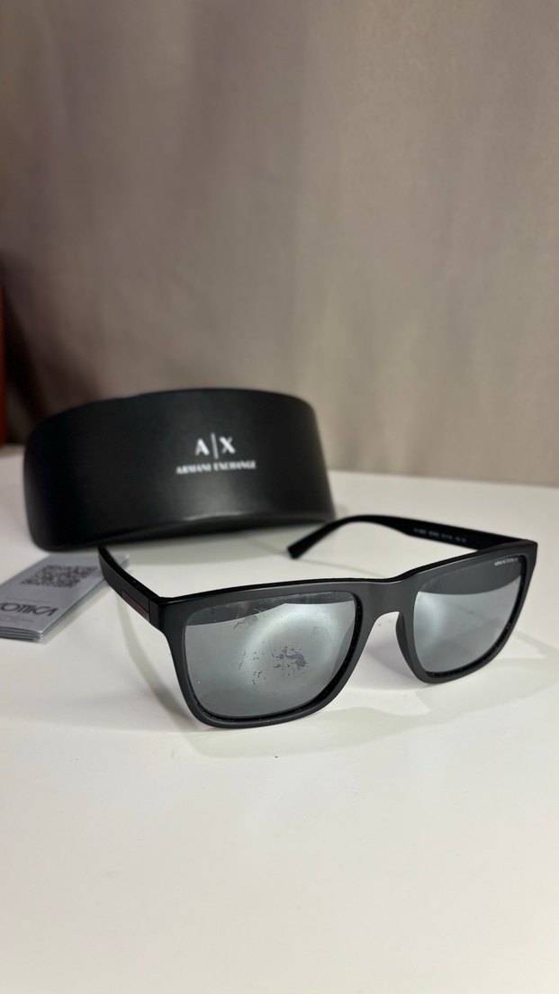 Gri yansıtıcı camlı siyah minimalist erkek güneş gözlüğü, üzerinde AX logosu bulunur. Koruyucu kutu ile birlikte gelir. ️