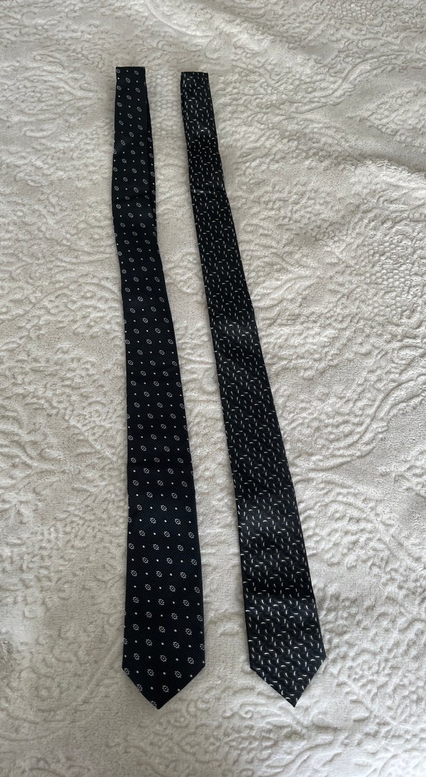 İki adet siyah erkek kravatı, minimalist desenlerle sokak stili için uygun. Her ikisi de koyu zeminde ince desenlere sahip.
