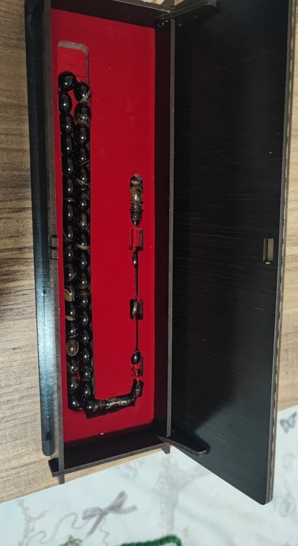 Kırmızı ip üzerinde dizili, siyah minimalist kaplan gözü ve klasik tasarımlı erkek tesbihi. Kendisine özel tasarım tesbih kutusu ile gönderim yapılacaktır.