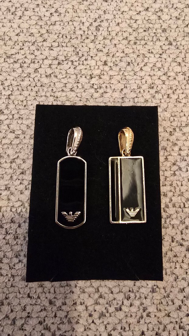 Bu erkek kolye ucu, minimalist siyah tasarımı, şık dikdörtgen şekli ve zarif marka logosuyla gümüş ve altın tonlarında sunuluyor.