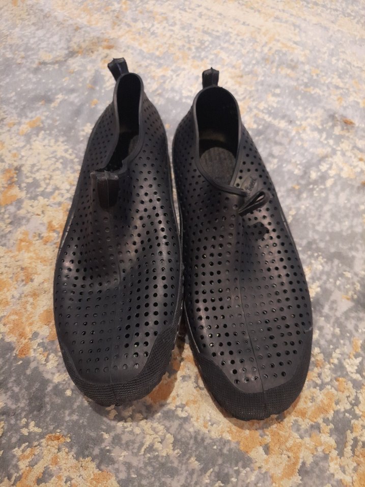 Lastik malzemeden yapılmış, delikli tasarımlı siyah erkek su ayakkabısı. Minimalist ve sokak stiline uygun, günlük kullanım için rahat ve şık.