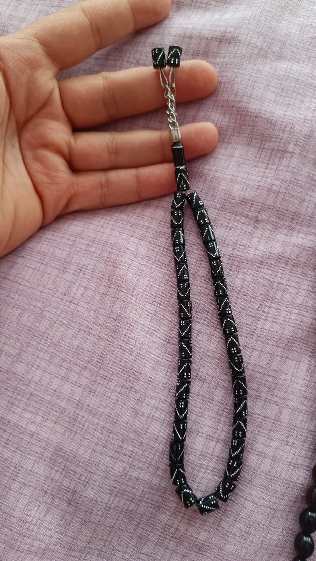 Koyu siyah renkte, minimalist tarzda erkek tesbihi. Geleneksel tasarım ve gümüş zincir detayı bulunur.