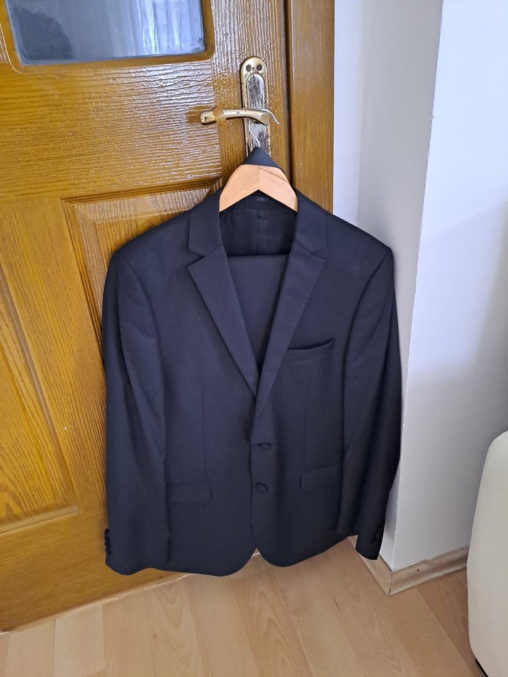 Siyah erkek takım elbise, klasik yakalı ve uzun kollu, modern klasik tarzda ve normal boyda. Ofis ve iş ortamları için uygundur, toka detaylıdır. ️